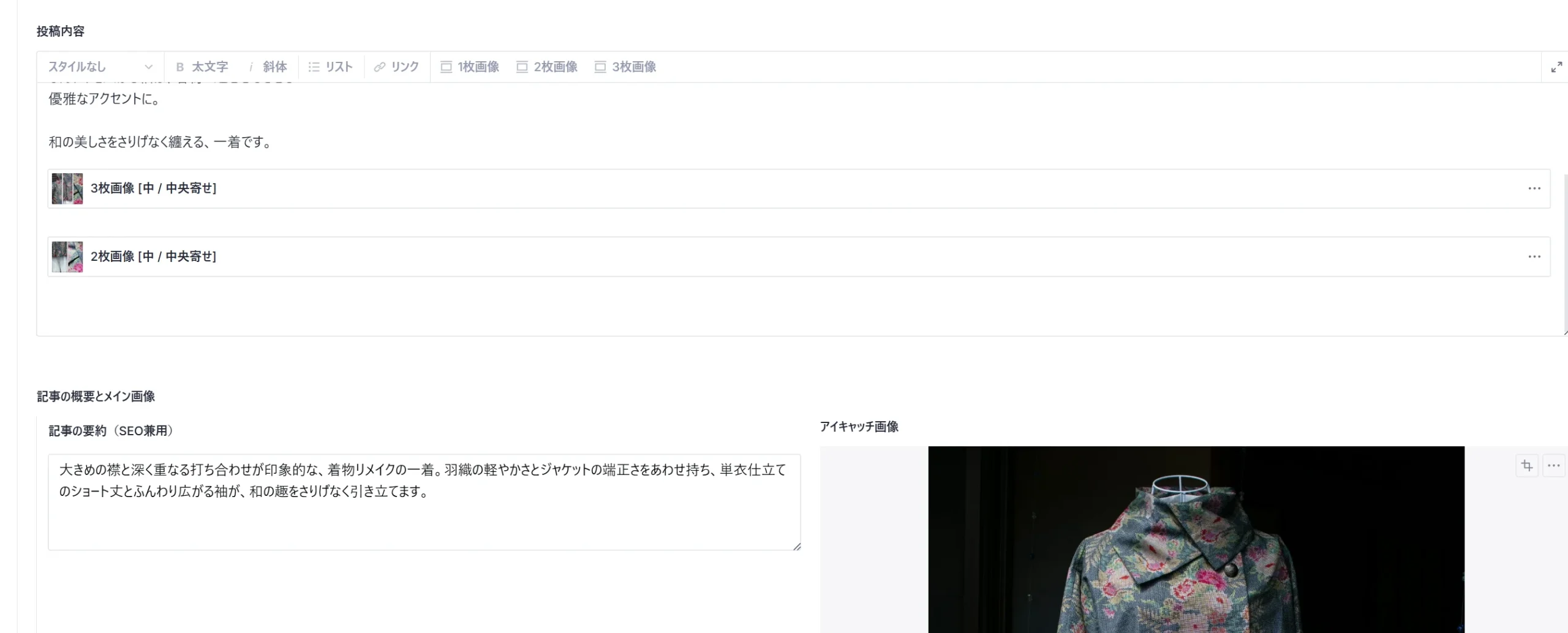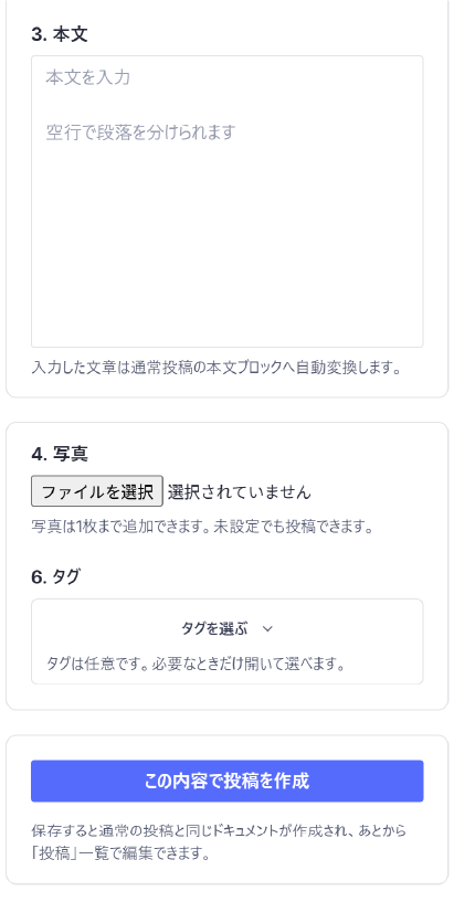入力する内容は、タイトル・カテゴリー・本文・写真など、かなりシンプルです。